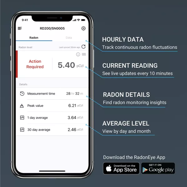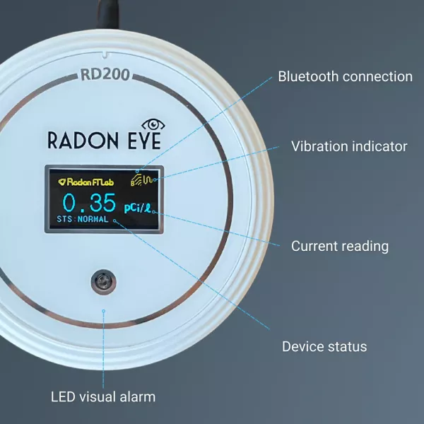 RadonEye je sodoben detektor radona, zasnovan za enostavno uporabo in zanesljivo dolgoročno spremljanje. Namestitev je hitra in preprosta, naprava pa omogoča povezavo s pametnim telefonom ali tablico (Android/iOS) preko Bluetooth povezave – kar je praktičnejše od WiFi, saj v kletnih in pritličnih prostorih pogosto ni signala.