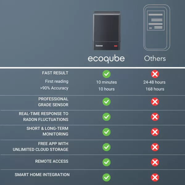 EcoQube je sodoben, inteligenten monitor radona, zasnovan za enostavno uporabo in natančno dolgoročno spremljanje. Namestitev je preprosta – napravo le priklopite, nato pa se poveže z vašim Wi-Fi omrežjem (2,4 GHz), kar omogoča oddaljen dostop do meritev kadarkoli preko mobilne aplikacije (iOS/Android).